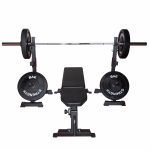 Dari kiri ke kanan : Squat stand, Adjustable bench, Olympic bar with collar, Bumper plate (30 Kg total), Small increment plate (7,5 Kg total)