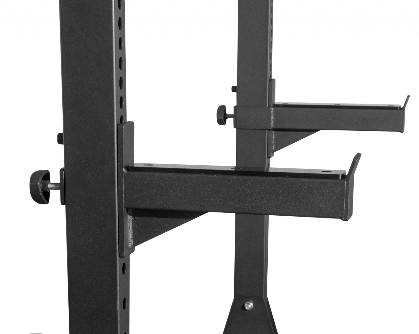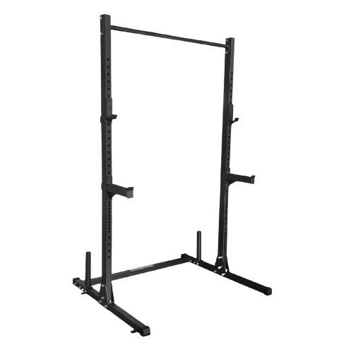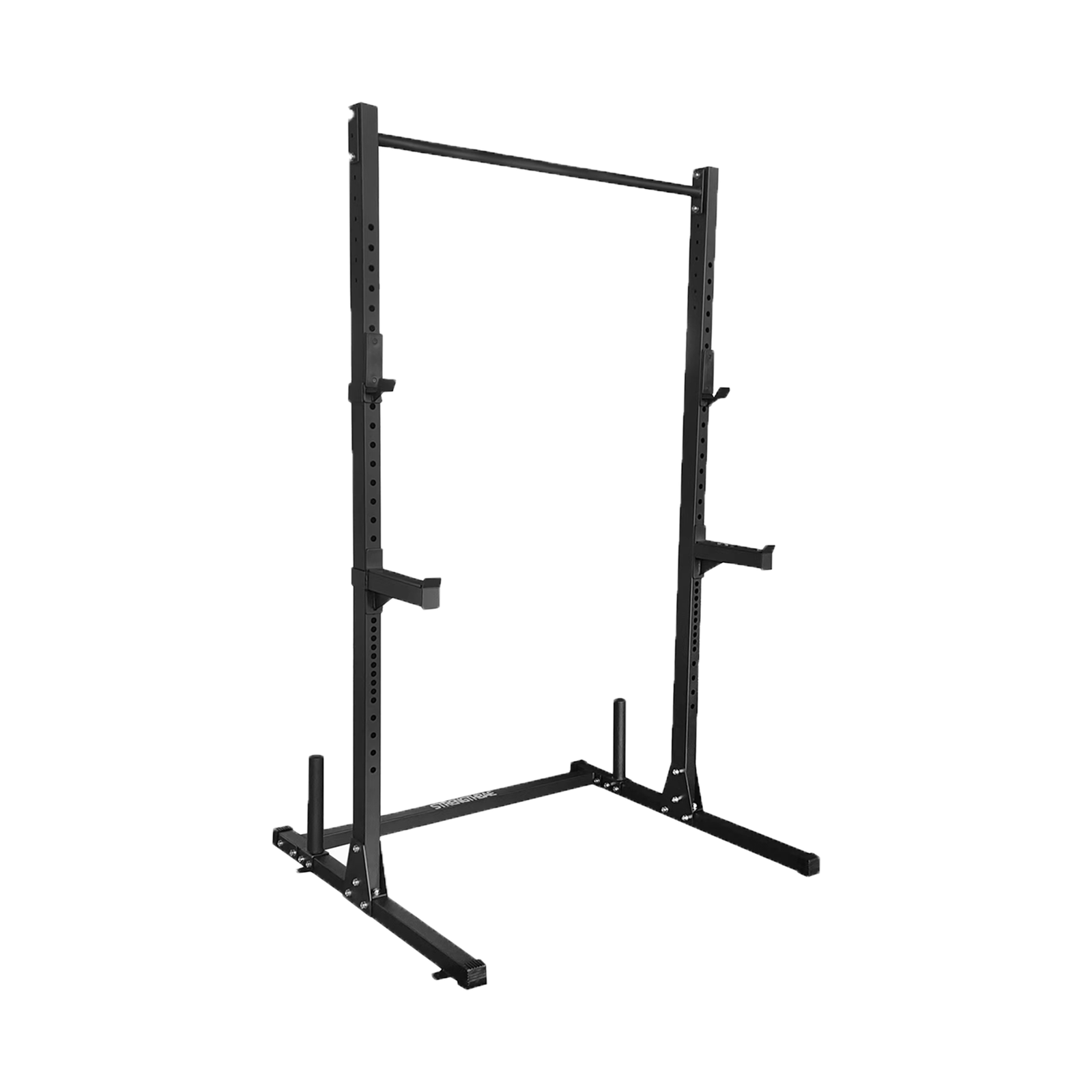 Perbedaan Half Rack dan Squat Stand adalah Half Rack kakinya tersambung, dan luas struktur bawah lebih besar, sehingga tentunya kestabilan jauh lebih baik. Tiang atas juga disambungkan dengan pull up bar, sehingga dapat digunakan untuk pull up maupun attachment cable pulley. Spotter arm untuk pengaman saat squat maupun bench juga sudah disediakan sehingga kamu akan lebih tenang dalam mengangkat beban berat. Seperti biasa, ada juga weight plate storage untuk meningkatkan kestabilan beban.