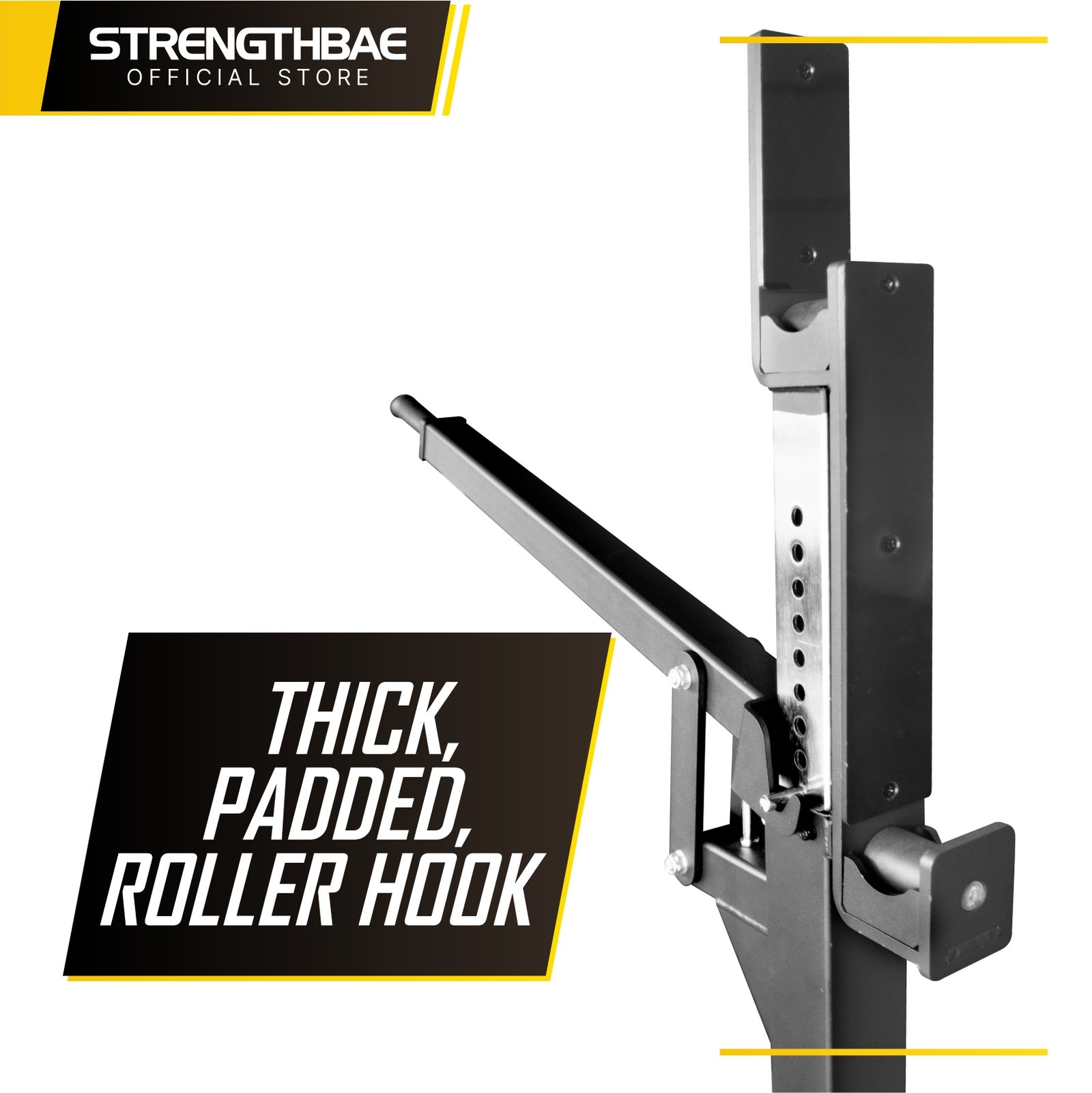 J-Hook berfungsi sebagai tempat untuk menaruh barbell anda. Ketinggian J-Hook serta ketebalannya sangat berpengaruh ke kenyamanan anda untuk unrack dan racking. Banyak rack murah yang hooknya tidak berbentuk J, sehingga barbell langsung berbenturan dengan tiang. Hal ini akan cepat merusak tiang dan barbell anda. Terkadang ada juga yang berstruktur J tapi pendek sekali, sehingga sama saja. J-Hook Power Rack Strengthbae didesain cukup tebal dan tinggi serta dilapis rubber untuk kenyamanan pemakaian dan ketahanan perlengkapan anda.