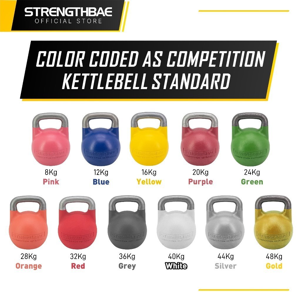 Warna dari kettlebell Strengthbae mengikuti standar competition kettlebell yang ada, jadi kamu tidak sulit membedakan beban karena sizenya yang sama, termasuk line hitam di beban transisi