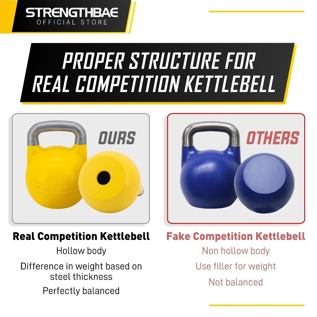 Competition Kettlebell yang asli memiliki bagian bawah berlubang, untuk menandakan jika perbedaan berat berasal dari ketebalan steel yang digunakan, area beban akan tersebar merata di seluruh diameter kettlebell. Kettlebell yang mengaku competition tapi bawahnya tidak hollow berarti sebenarnya bebannya berasal dari pemberat yang ada di dalam kettlebell, ini mengakibatkan beban tidak tersebar merata, bukan real competition kettlebell.