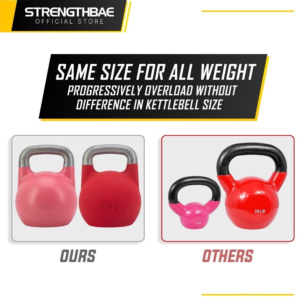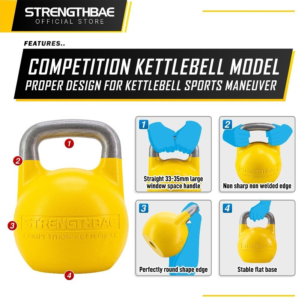 Competition Design memiliki 1 keunggulan yang sangat krusial dibanding dengan kettlebell biasa, yakni semua beban ukurannya sama persis. Ini penting sehingga kamu bisa berlatih dengan ukuran handle, jarak dari lantai, dan diameter kettlebell yang selalu konstan. Perpindahan ketika progressive overload akan terasa di beban saja. Tidak seperti desain kettlebell pada umumnya dimana yang ringan kecil, makin berat makin besar. Desain competition kettlebell juga handlenya memiliki sudut yang besar, tidak seperti handle kettlebell non competition yang meruncing, tidak nyaman untuk manuver. Jangan bandingkan juga dengan kettlebell dengan desain aneh yang menyasar orang yang tidak paham fungsi dan sport kettlebell.