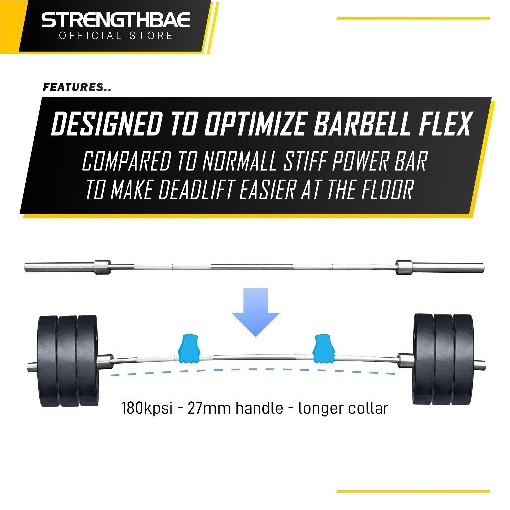 1. Designed To Maximize Flex Lengkungan pada berbell dipengaruhi berbagai faktor, mulai dari tipe besi, diameter besi, panjang collar pembatas, titik lokasi pertama plate, hingga tensile strength dari barbell. Pada PR breaker bar ini, barbell sudah dimaksimalkan desainnya dan specnya agar mudah melengkung off the floor, sehingga awalan deadlift jadi lebih mudah karena plate terangkat satu demi satu tidak sekaligus seperti pada stiff bar.