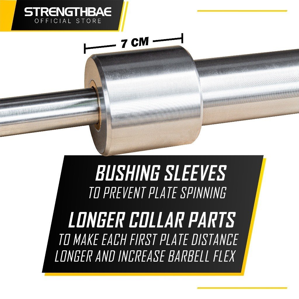 3. Bushing & Long Collar Barbell memiliki mekanisme bushing sehingga plate tidak berputar saat kamu melakukan deadlift yang dapat mengganggu balance. Collar yang lebih panjang juga membuat plate pertama lebih jauh dari titik tengah sehingga barbell akan lebih mudah melengkung.