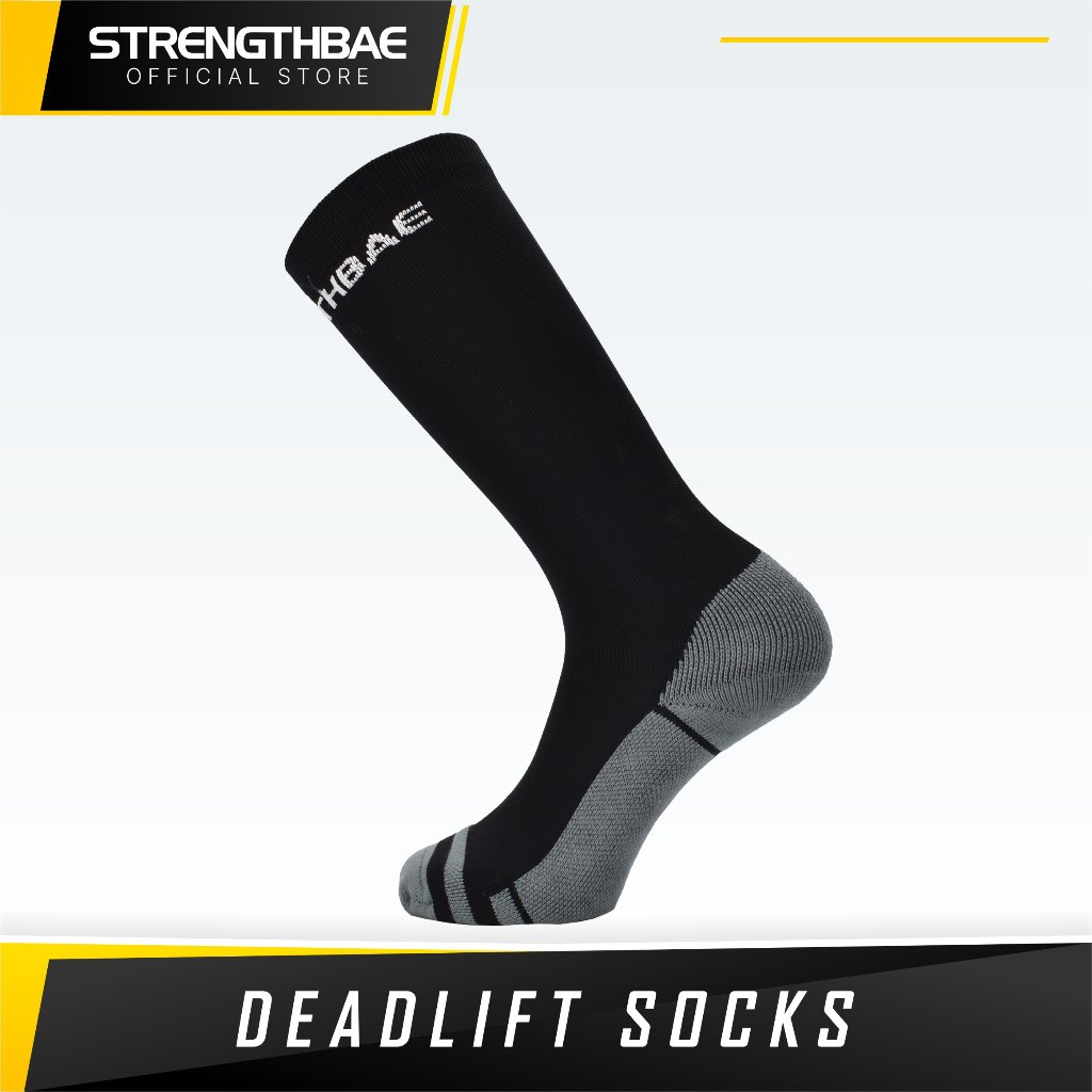 Deadlift socks adalah kaus kaki yang didesain untuk melindungi tulang kering kamu dari gesekan barbell. Deadlifter handal bisa menjaga barbell sangat dekat dengan badan, nah seringkali knurling menggesek kulit hingga berdarah, Deadlift Socks Strengthbae akan mencegahnya.