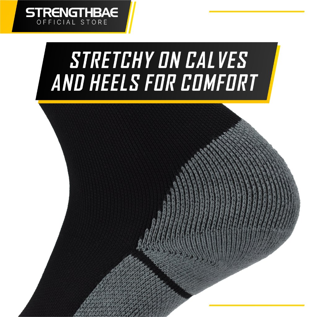 Selain itu, Deadlift Socks Strengthbae juga didesain stretchy / mudah merenggang di area tumit dan betis, nyaman bagi kamu yang kakinya jumbo dan betisnya besar.