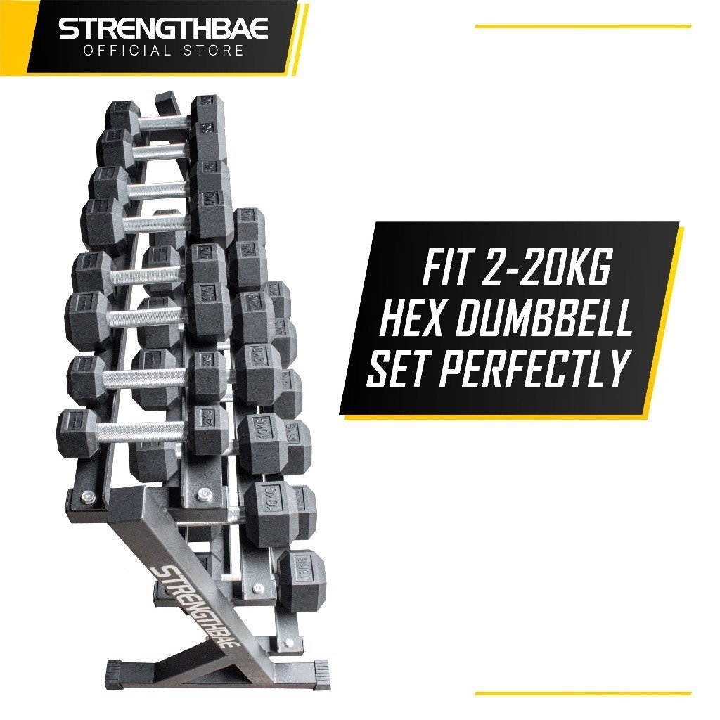 Strengthbae juga memiliki hex dumbbell, nah rack ini sudah tested bisa menampung set 2-20kg dengan baik. Jangan khawatir, hex dumbbell termasuk dumbbell dengan size terbesar di pasaran karena ujungnya rubber, jadi kalau dumbbell kamu berbeda, tetap akan muat selama panjang handle sesuai standar.