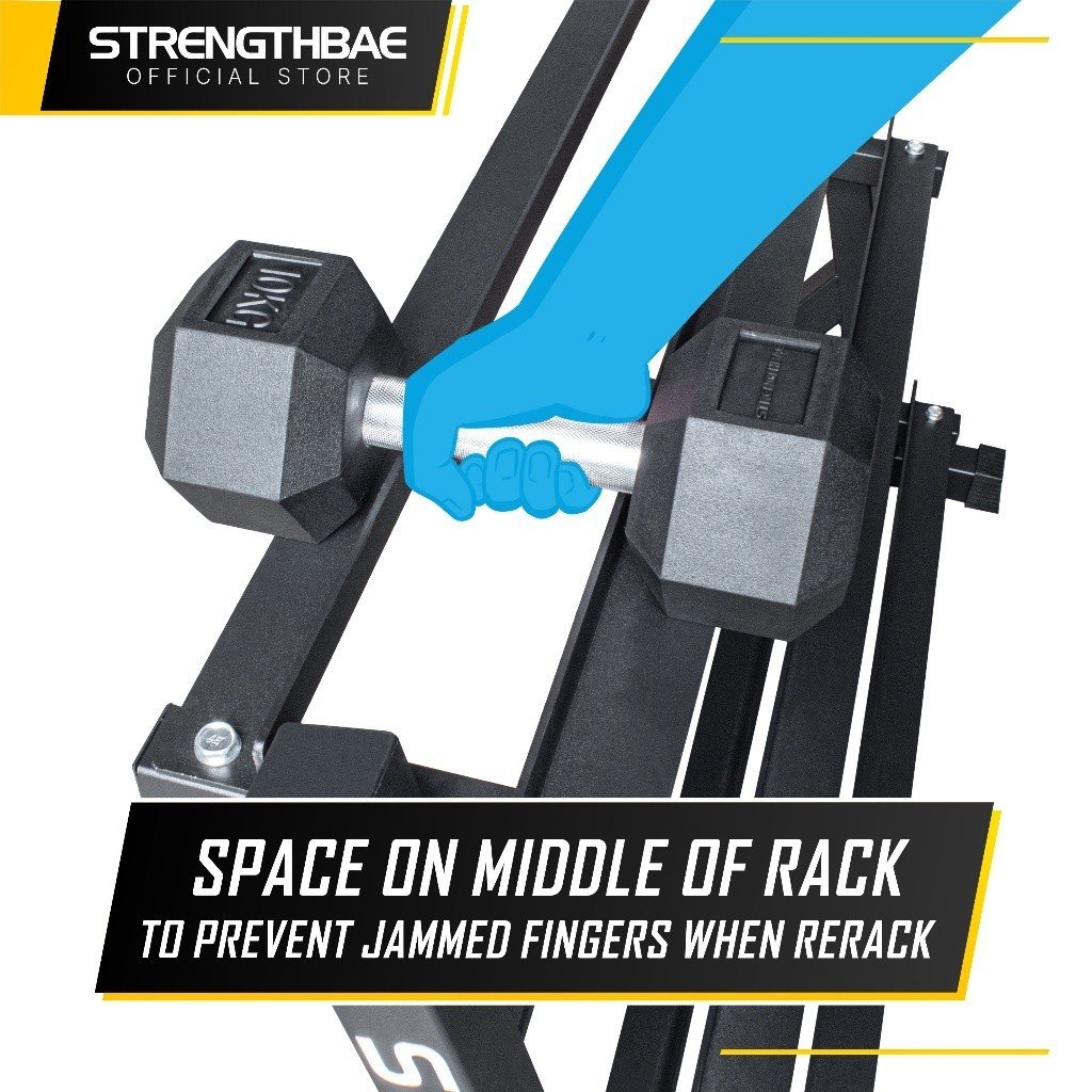 Salah satu yang ditakutkan pada dumbbell rack adalah jarak bagian tengah yang sempit, karena saat menaruh dumbbell yang berdekatan jari mudah terjepit. Nah rack Strengthbae memiliki rongga di bagian tengah sehingga tanganmu aman dari kegencet dumbbell dan rack!