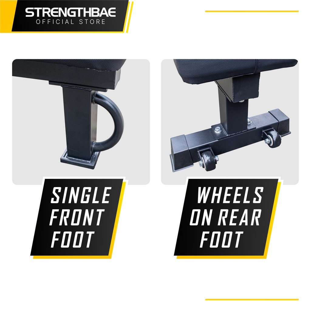 5. Wheels On Rear Foot Kaki belakang diberi roda untuk memudahkan pindah memindah bench. 6. Heavy Duty Construction Mampu menampung beban hingga 450kg, sehingga kamu tidak perlu was-was ketika heavy benching!