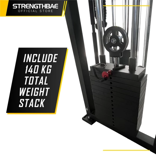 Cable Machine sudah include total 140kg weight stack (70kg persisi), tinggal colok kalau mau pakai. Kebanyakan cable machine murah tidak include weight stack tapi plate loaded jadi kamu perlu punya plat beban dulu, endingnya sama saja menambah biaya. Model plate loaded juga mengakibatkan kamu sulit superset karena bebannya harus dibongkar pasang dulu.
