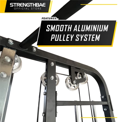 Kebanyakan cable machine murah di pasaran memiliki kelemahan tarikannya seret. Hal ini diakibatkan pulley yang digunakan plastik, sistem katrolnya menyambung di tengah sehingga friksinya banyak, dan banyak katrol yang tidak sejajar. Cable Machine Strengthbae sangat mulus layaknya cable machine yang kamu temui di gym. Hal ini disebabkan karena desainnya, katrolnya aluminium, sistem katrol kanan dan kiri terpisah berdiri sendiri, dan semua katrol sejajar membentuk garis lurus, sehingga friksi yang dihasilkan sangat minim dan tarikannya mulus.