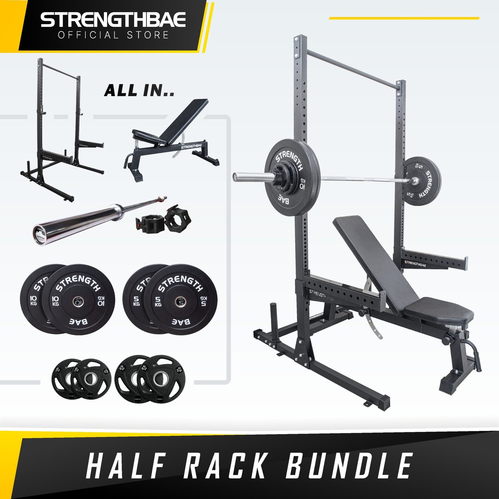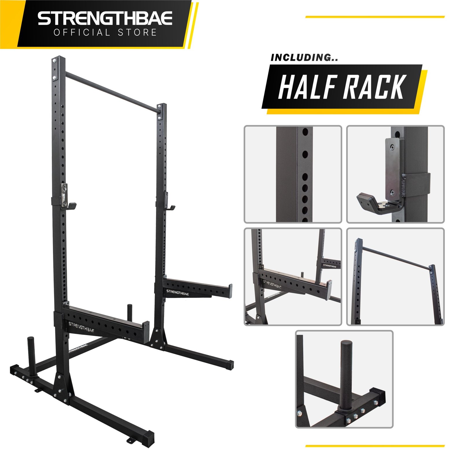 Berbeda dengan free squat stand yang tidak ada penyambung antar stand, half rack memiliki sambungan di struktur bawah serta pull up bar di atas. Dengan demikian kestabilan yang diberikan akan jauh lebih baik dan lebih nyaman digunakan untuk heavy squat dan bench press.⁣ ⁣