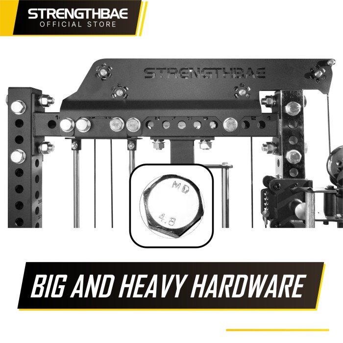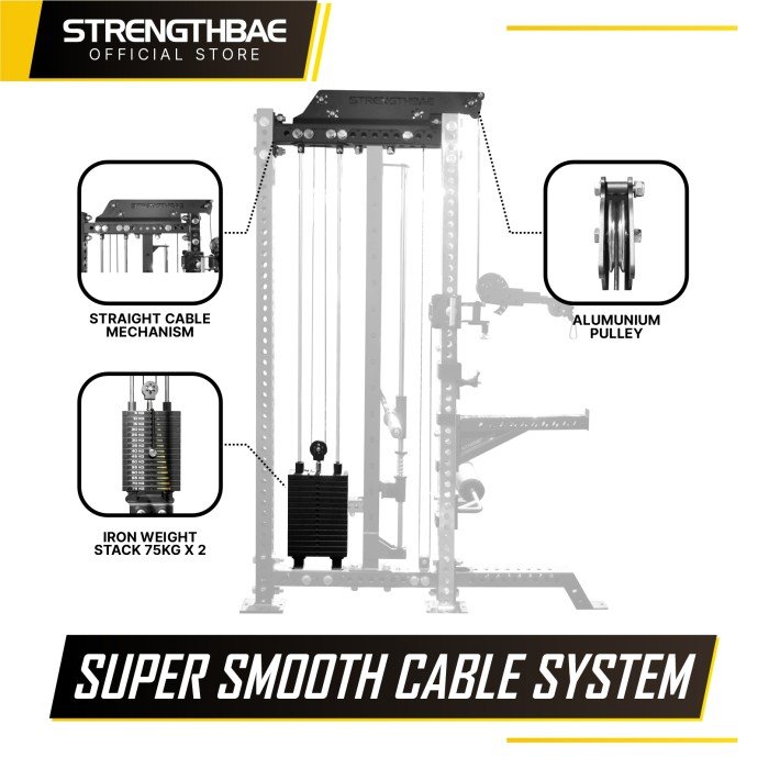 Sudah termasuk smith machine dengan bearing berkualitas tinggi, menghasilkan gerakan super smooth untuk latihan seperti smith squat, bench press, dan gerakan favorit di smith machine lainnya.