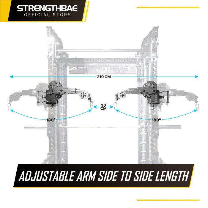 Pulley bagian depan bukan pulley biasa. Infinity Series menggunakan Infinity Arms di bagian depan, memungkinkan pulley diarahkan ke berbagai sudut. Kamu bisa melakukan wide chest flye, close grip chest-supported row, reverse flye, cable shrug, tricep press, dan berbagai variasi lain yang sebelumnya mustahil dilakukan di rack standar. Puluhan variasi angle bisa kamu mainkan sesuai kebutuhan kamu!