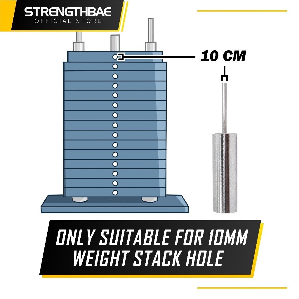 Nah, pakai Pin Extender dari Strengthbae saja! Pin Extender ini fungsinya untuk dicolokkan ke lubang weight stack, nah setelah itu kamu bisa memasukkan plate ke bagian sleevesnya, jadi kamu bisa mengangkat lebih berat dari weight stack yang tersedia! Apa keunggulan Pin Extender Strengthbae?