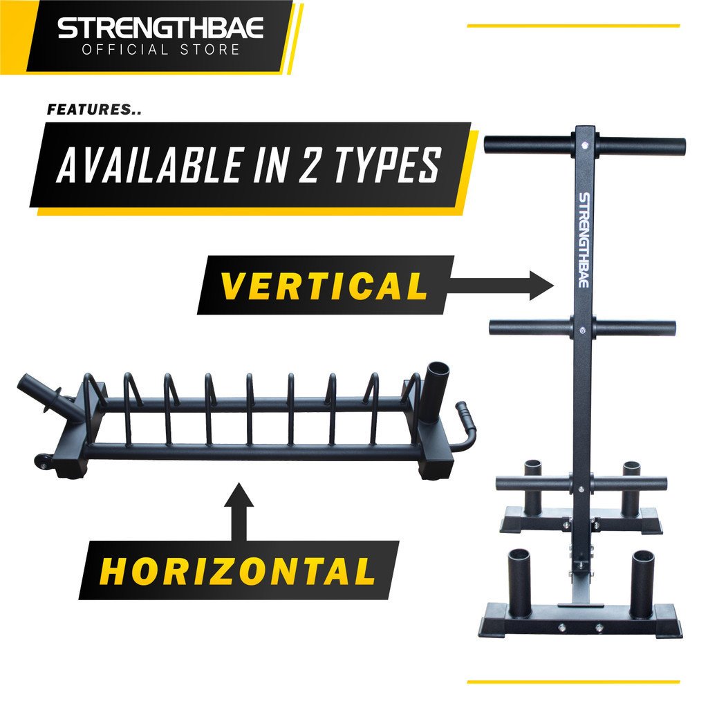 – Vertical, desainnya berdiri tegak lurus dengan lantai. Cocok untuk diletakkan di lokasi yang dekat dengan rack. Penyimpanan plate yang tinggi memudahkan seseorang untuk memindahkan plate dari storage ke barbell di rack saat squat maupun pressing.