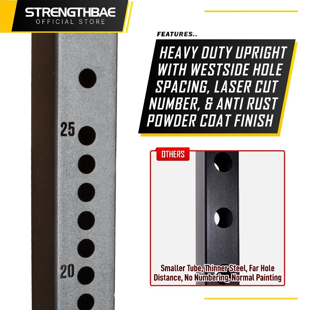 Westside hole spacing adalah jarak antar lubang yang didesain memiliki jarak lebih dekat di area bench press. Hal ini membuat pengaturan peletakan untuk J-Hook jadi lebih presisi, sehingga unrack dan racking menjadi lebih nyaman dan safe. Kebanyakan rack dipasaran memiliki jarak antar lubang yang lebar, sehingga peletakkan hook bisa terlalu tinggi atau terlalu rendah.