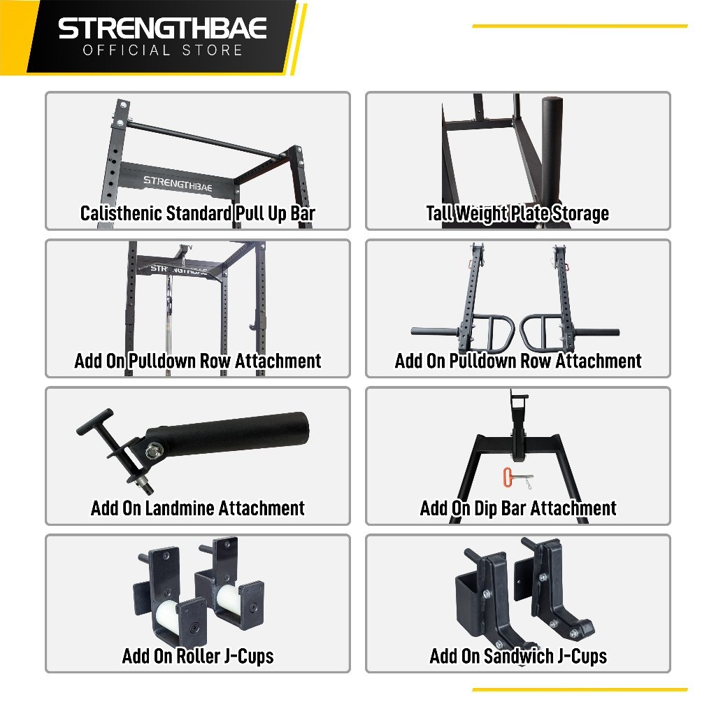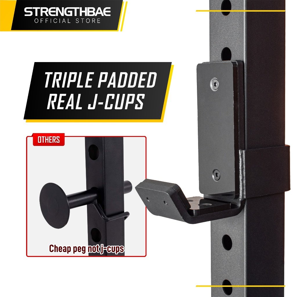 J-Hook berfungsi sebagai tempat untuk menaruh barbell anda. Ketinggian J-Hook serta ketebalannya sangat berpengaruh ke kenyamanan anda untuk unrack dan racking. Banyak rack murah yang hooknya tidak berbentuk J, sehingga barbell langsung berbenturan dengan tiang. Hal ini akan cepat merusak tiang dan barbell anda. Terkadang ada juga yang berstruktur J tapi pendek sekali, sehingga sama saja. J-Hook Power Rack Strengthbae didesain cukup tebal dan tinggi serta dilapis rubber untuk kenyamanan pemakaian dan ketahanan perlengkapan anda.
