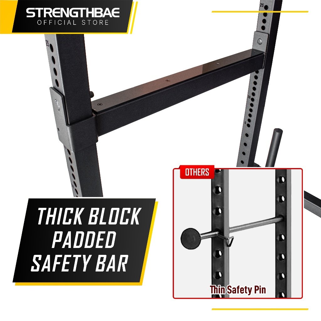 Adanya safety pin akan membuat anda merasa lebih tenang ketika melakukan compound movement dengan intensitas mendekati failure. Hal ini akan membuat anda bisa lebih pushing to the limit. Selain itu adanya westside hole spacing juga membuat safety pin dapat diadjust dengan presisi tanpa takut terlalu tinggi dan menganggu gerakan inti atau terlalu rendah sehingga semakin sulit untuk bail out. Safety pin juga dapat digunakan untuk berbagai gerakan dead stop dengan pin, seperti pin squat, pin press, dan lain sebagainya.