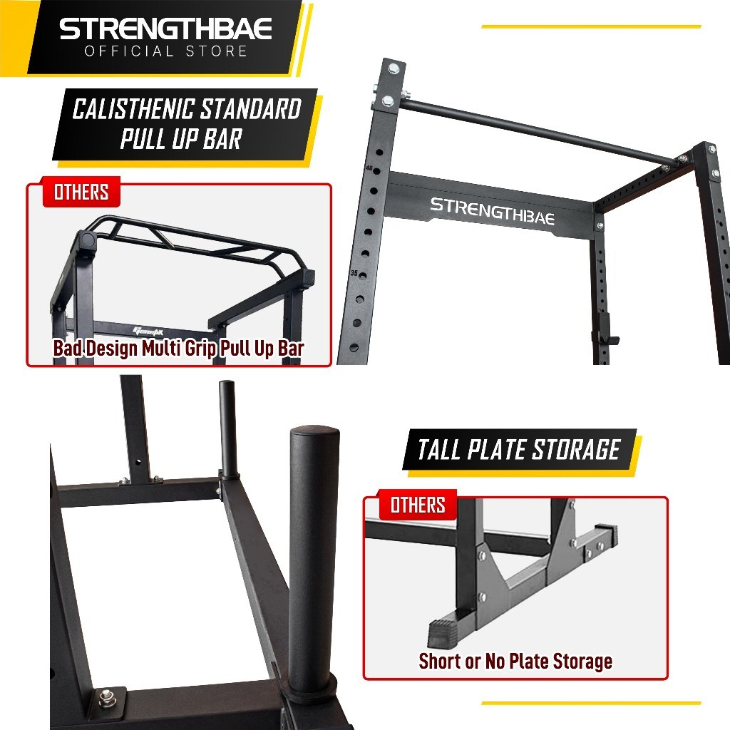 Pull up bar Power Rack Strengthbae memiliki diameter standar sehingga nyaman digenggam. Selain itu model pull up bar yang lurus tanpa ada bentuk lengkungan ke bawah ataupun netral grip justru membuat anda leluasa melakukan pull up sesuai dengan struktur sendi bahu anda.