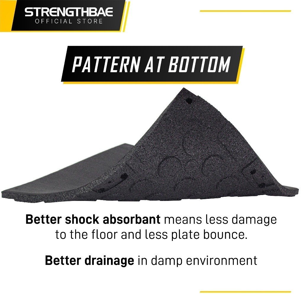 Gym Mat Strengthbae menggunakan vulcanized rubber. Vulcanized rubber memiliki kelebihan bentuknya lebih terjaga, tidak mudah melengkung kedalam. tidak mudah terkoyak akibat gesekan, tidak menyerap air sehingga apabila kena keringat atau tumpahan cairan mudah dibersihkan, berperan sebagai peredam yang baik, dan tidak bau seperti rubber mat murahan yang non vulcanized.