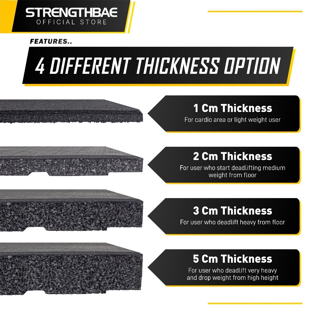 1cm cocok untuk alas home gym yang penggunaannya tidak untuk membanting-banting, misal di area cardio dan non heavy lifting users. 2cm cocok untuk yang mulai ada benturan di lantai, misal berencana melakukan deadlift dari lantai. 3cm cocok untuk yang ada gerakan benturan keras seperti heavy deadlift atau Olympic weightlifting movement yang ada kecenderungan melepas barbell dari ketinggian.