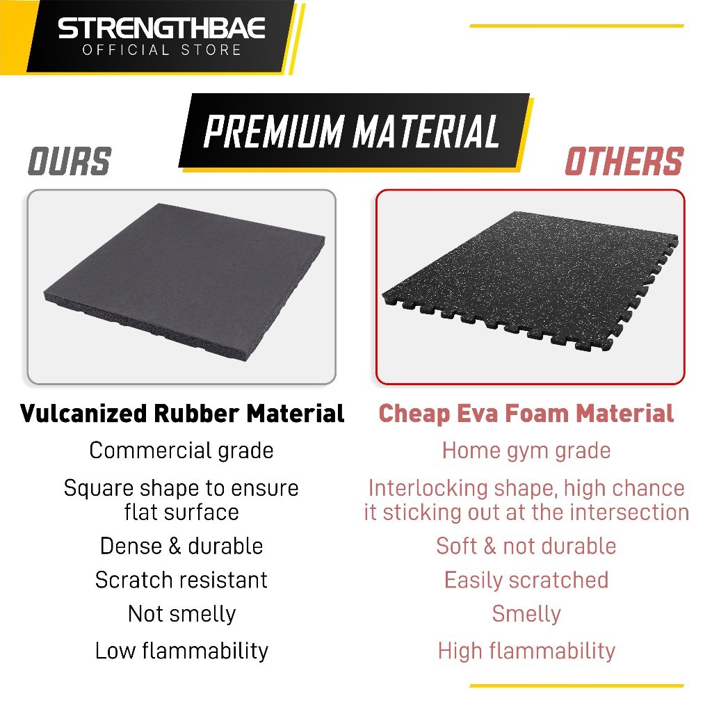Gym Mat Strengthbae menggunakan vulcanized rubber. Vulcanized rubber memiliki kelebihan bentuknya lebih terjaga, tidak mudah melengkung kedalam. tidak mudah terkoyak akibat gesekan, tidak menyerap air sehingga apabila kena keringat atau tumpahan cairan mudah dibersihkan, berperan sebagai peredam yang baik, dan tidak bau seperti rubber mat murahan yang non vulcanized.