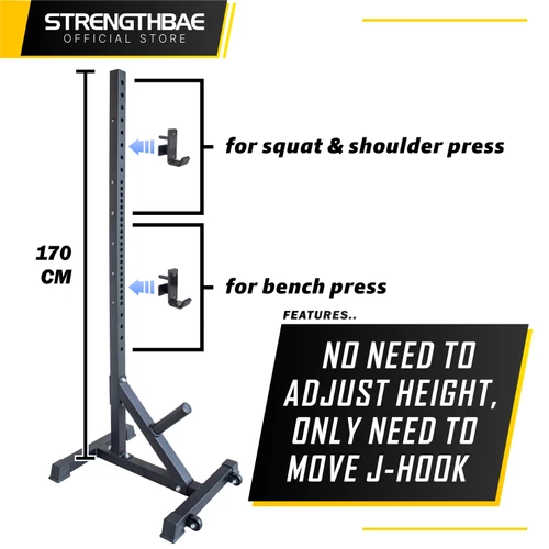 J-Hook berfungsi sebagai tempat untuk menaruh barbell anda. Ketinggian J-Hook serta ketebalannya sangat berpengaruh ke kenyamanan anda untuk unrack dan racking. Banyak rack murah yang hooknya tidak berbentuk J, sehingga barbell langsung berbenturan dengan tiang. Hal ini akan cepat merusak tiang dan barbell anda. Terkadang ada juga yang berstruktur J tapi pendek sekali, sehingga sama saja. J-Hook Power Rack Strengthbae didesain cukup tebal dan tinggi serta dilapis rubber untuk kenyamanan pemakaian dan ketahanan perlengkapan anda.