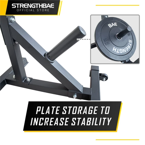 Bagian kaki terdapat plate storage, bisa untuk menambah beban rack sehingga sangat stabil saat dipakai, squat dan bench press 100kg++ tidak takut goyang-goyang!